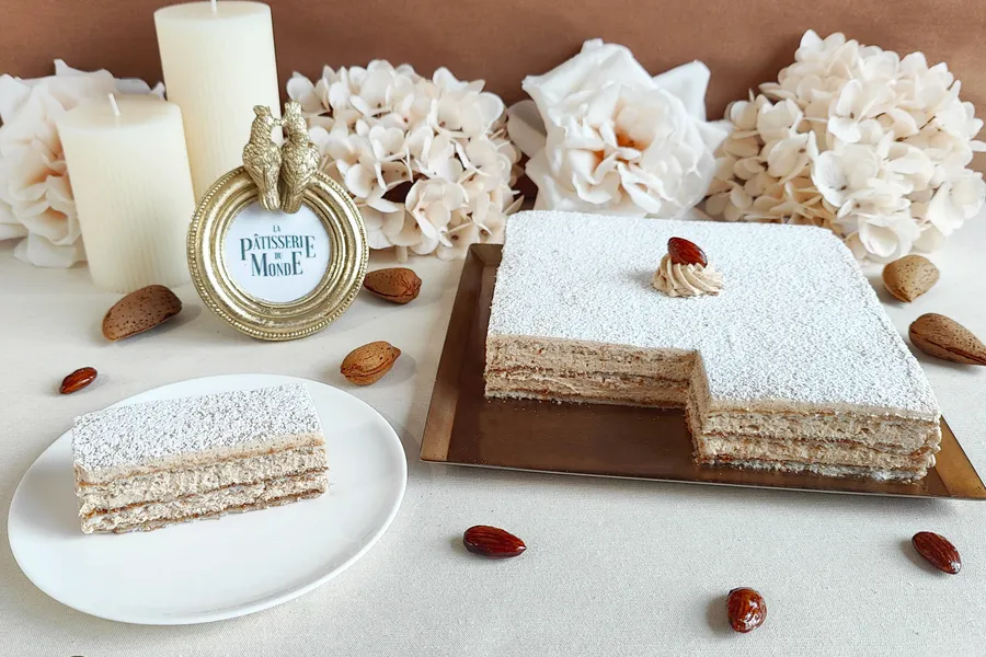 The Russian cake served at the Exposition Universelle of 1855 combined a daquoise cake, traditionally made with egg whites and almonds, with a praline mousseline cream, a soft and creamy blend of pastry cream with praline and butter. This contrast of textures, with the crunchy base and smooth filling, made the cake an instant success among the high society of the time, marking a milestone in French patisserie.